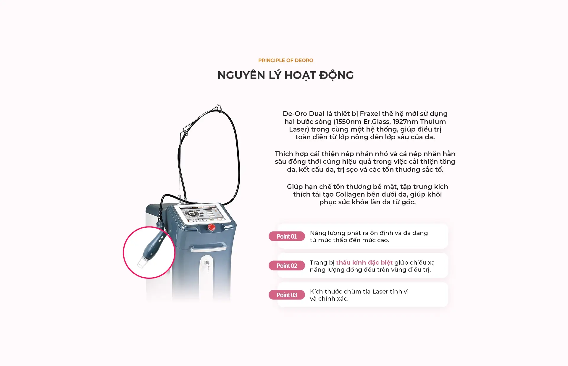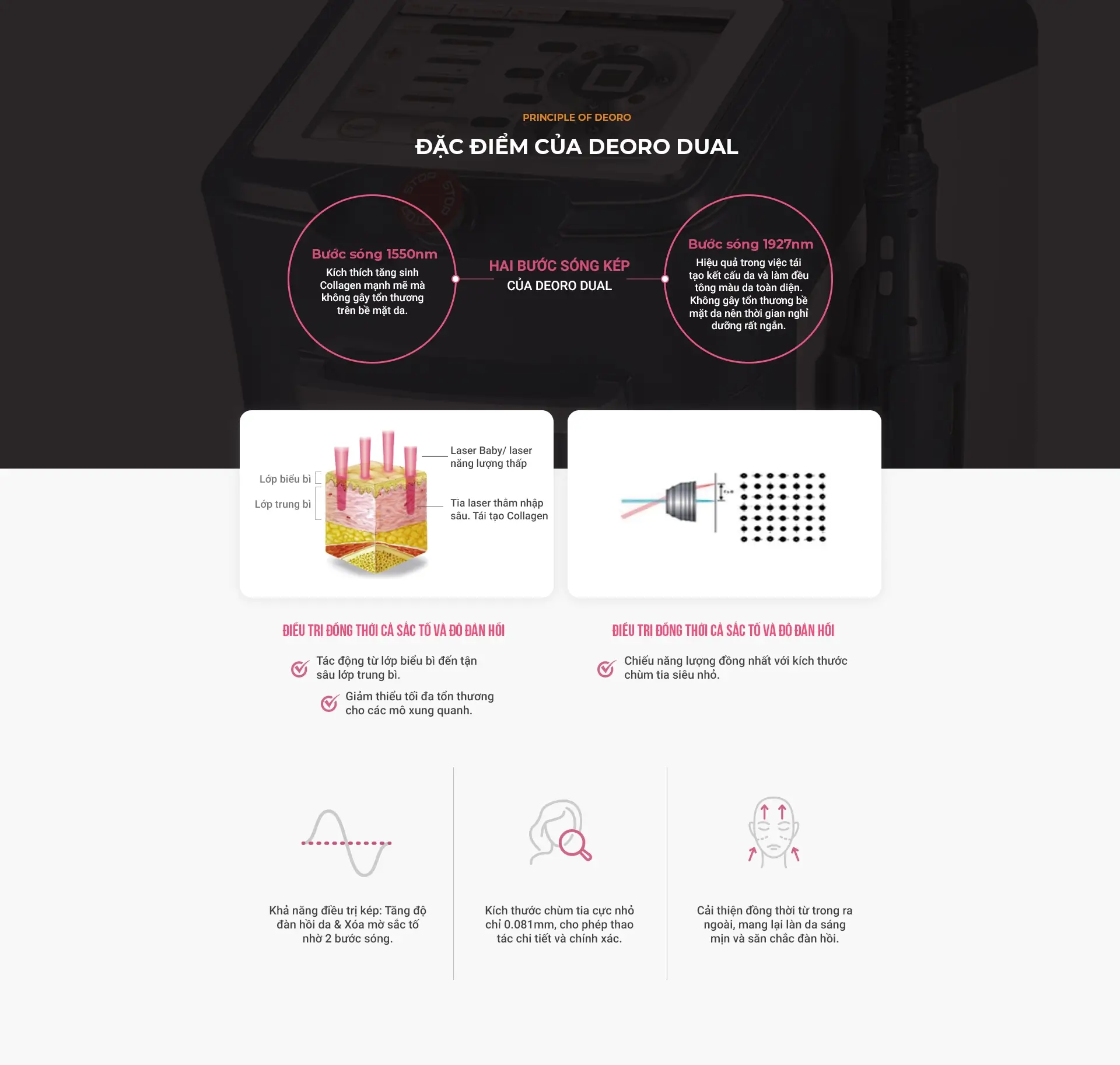 Đây là dòng Laser Fractional thế hệ mới nhất, giúp giảm thiểu tổn thương da và thúc đẩy tái tạo mô hiệu quả. Sử dụng đồng thời hai bước sóng (1550nm và 1927nm), máy tác động từ lớp biểu bì đến tận sâu lớp trung bì để tái sinh làn da.