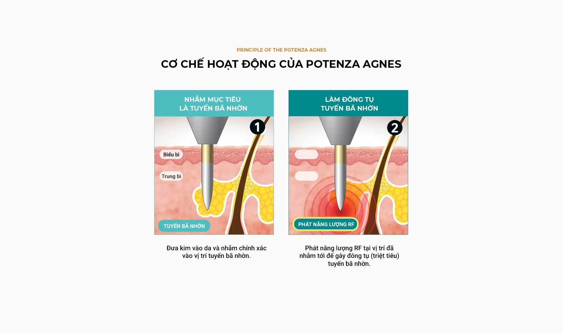 Agnes là phương pháp sử dụng kim RF (sóng vô tuyến) đưa trực tiếp vào da để truyền năng lượng nhiệt, từ đó phá hủy trực tiếp tuyến bã nhờn (nguyên nhân gây mụn).