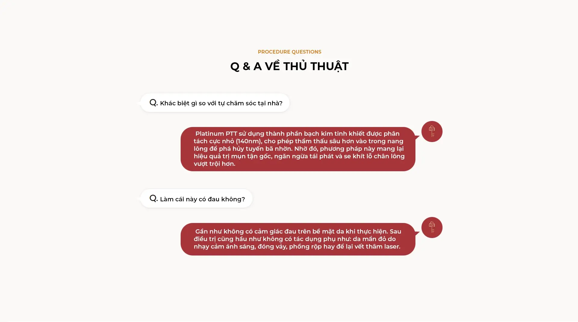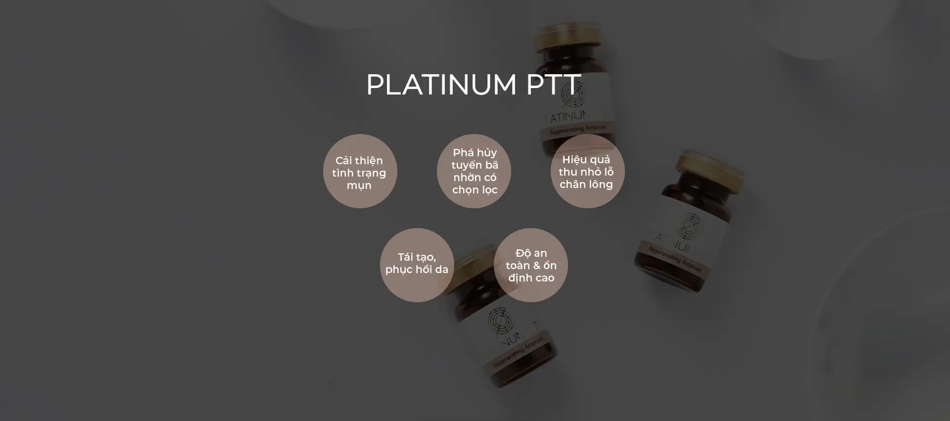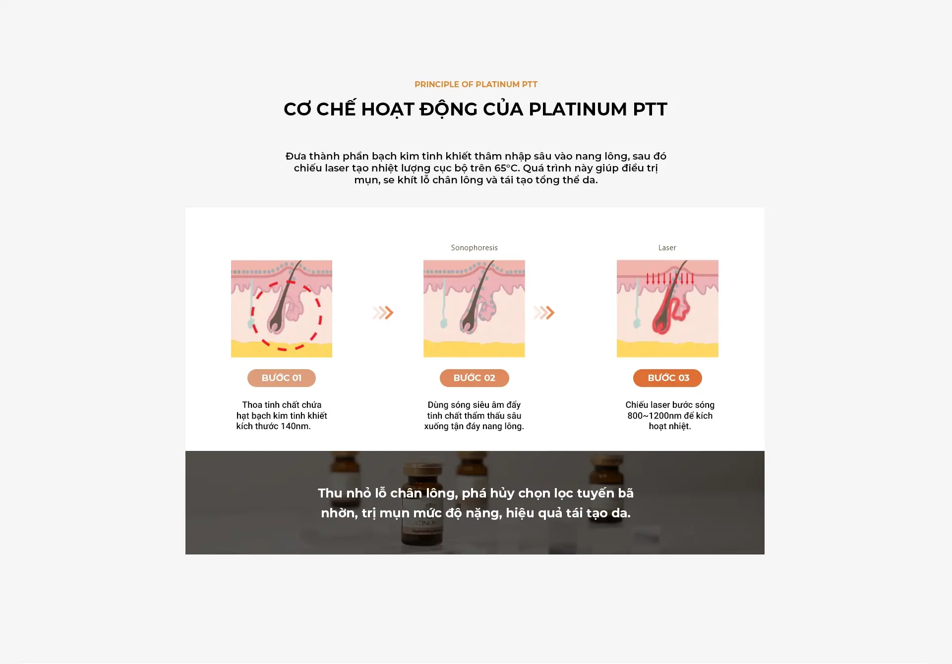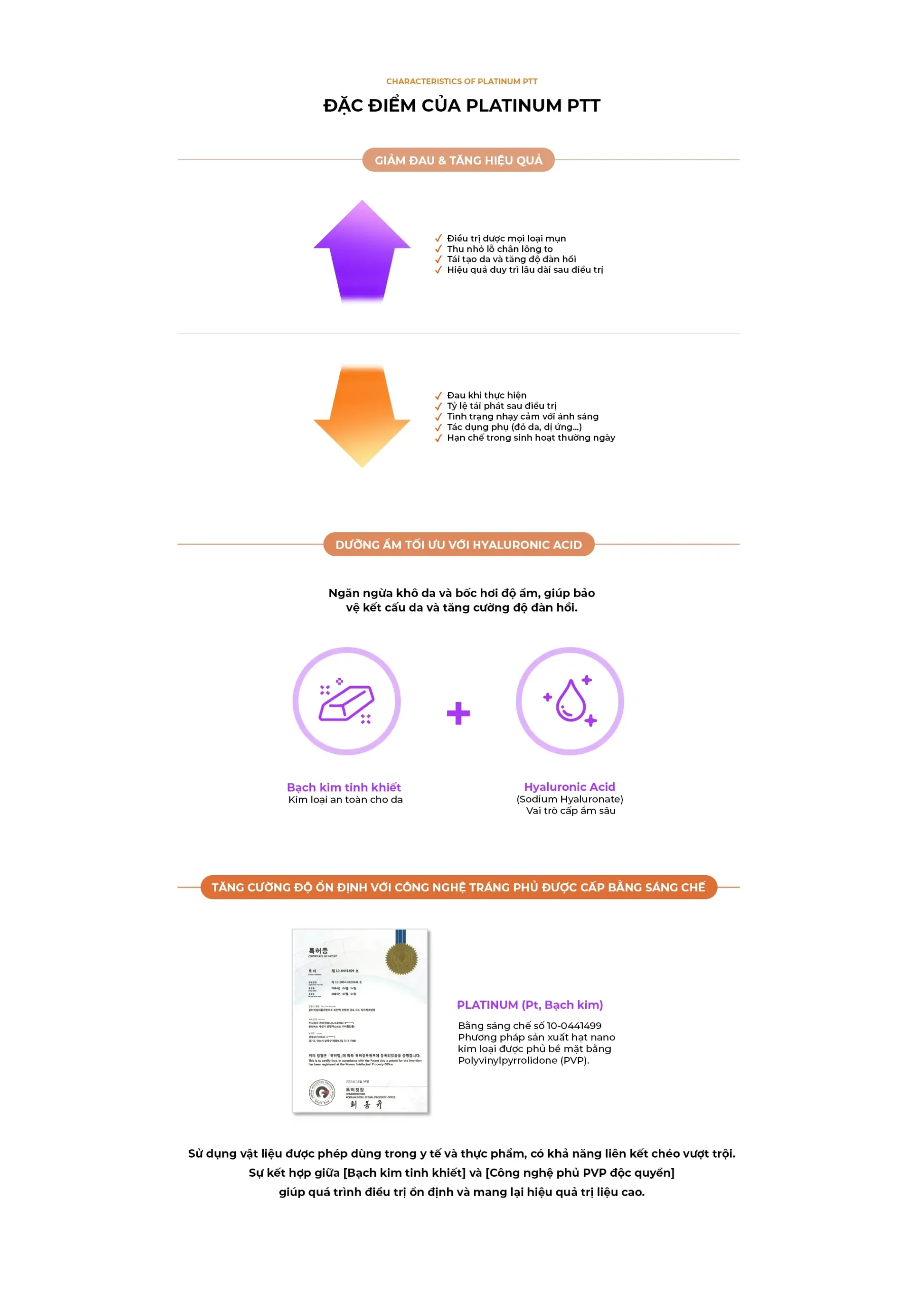 Platinum PTT sử dụng các thành phần bạch kim tinh khiết kích thước siêu nhỏ (140nm) để thẩm thấu sâu xuống tận gốc nang lông. Khi chiếu laser bước sóng 800~1200nm, hạt bạch kim hấp thụ nhiệt và phá hủy các tuyến bã nhờn lân cận.
