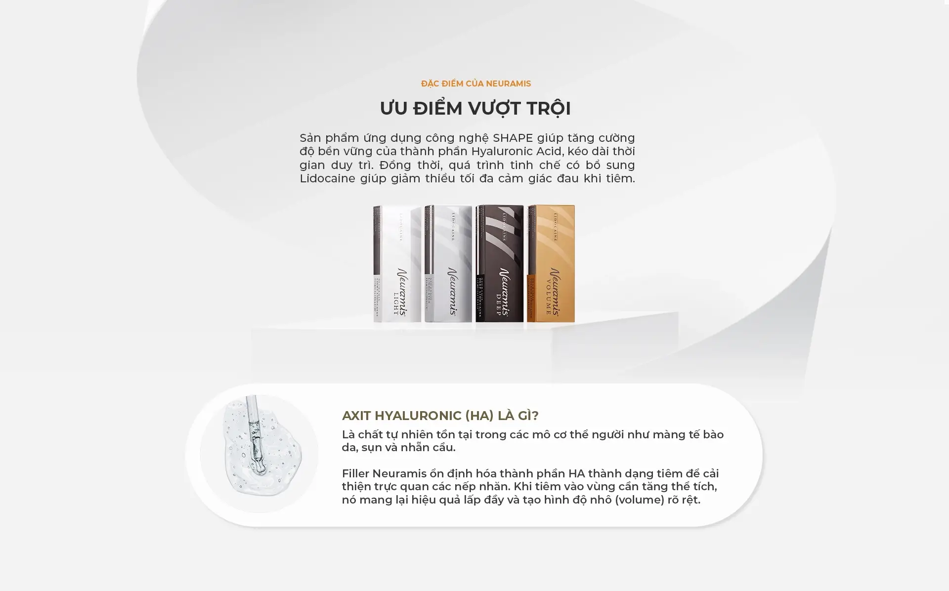 Đây là phương pháp tiêm chất làm đầy có thành phần Axit Hyaluronic (HA) dễ dàng tương thích với cơ thể vào các vùng cần cải thiện độ đầy đặn hoặc xóa nhăn, giúp định hình khuôn mặt và cải thiện nếp nhăn hiệu quả.