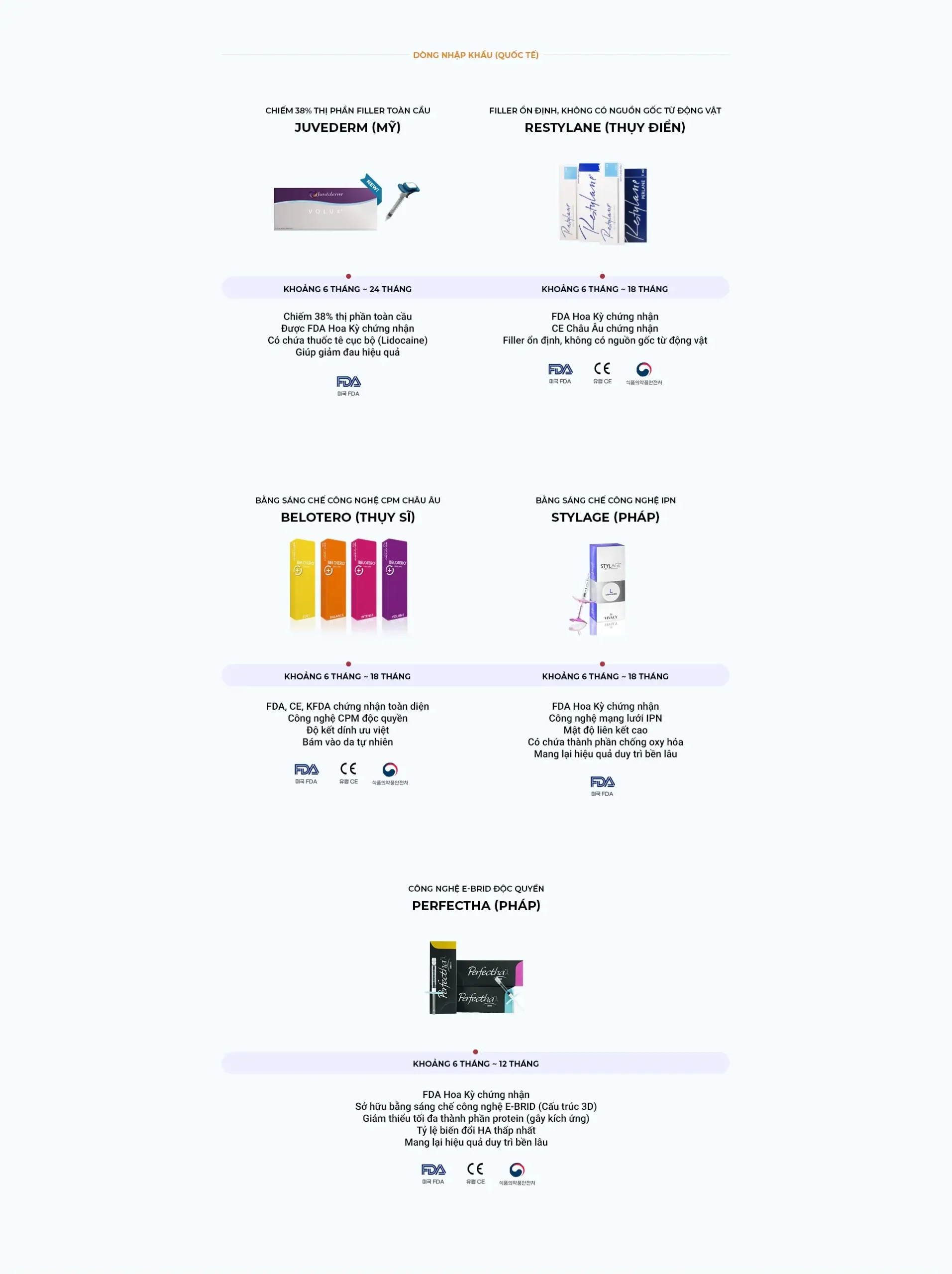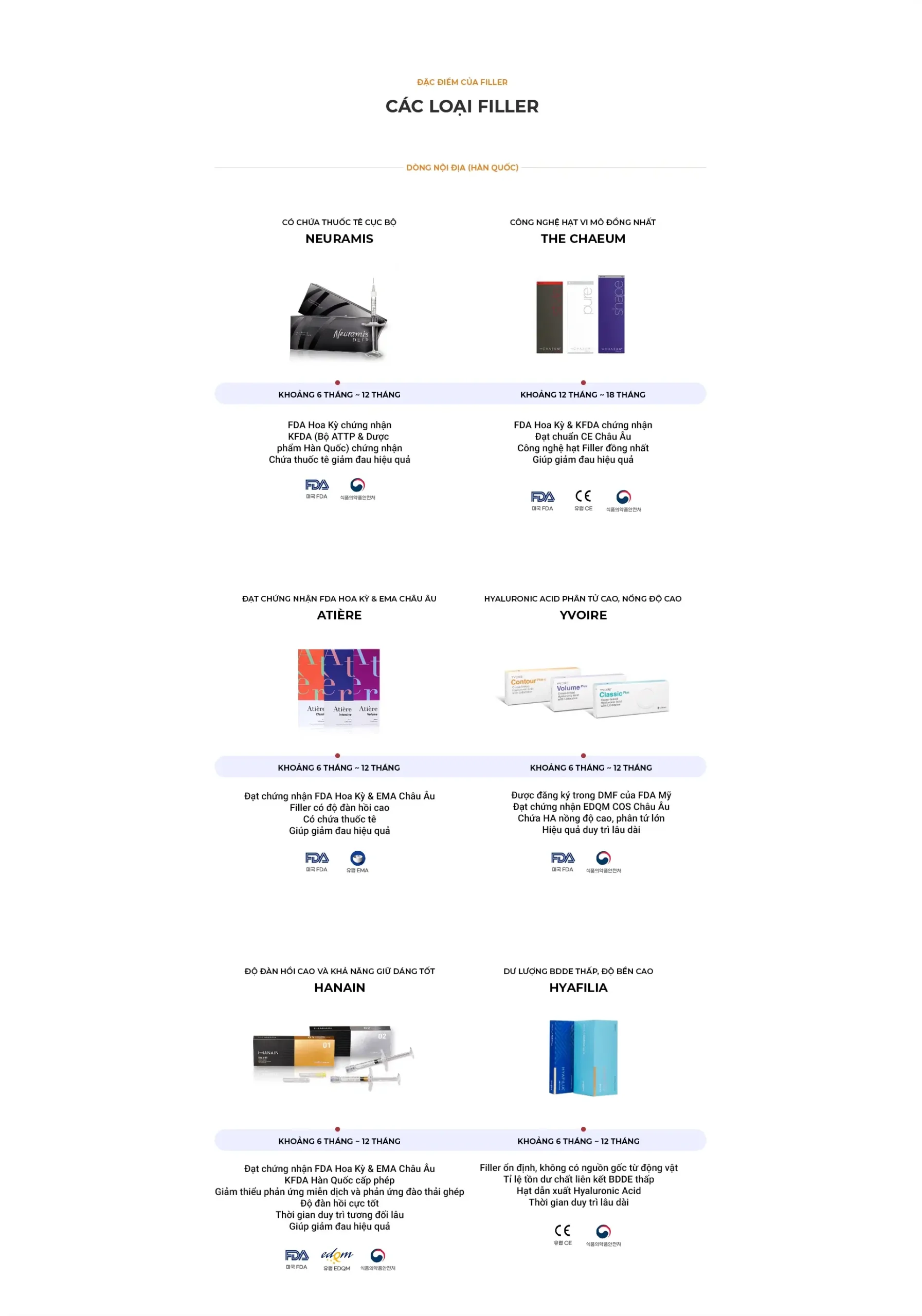 1 Thời gian duy trì của Filler sẽ khác nhau tùy thuộc vào cơ địa, vị trí tiêm và loại sản phẩm. Thông thường, Filler nội địa Hàn Quốc duy trì từ 6 – 12 tháng, còn Filler nhập khẩu (Âu/Mỹ) duy trì từ 12 – 18 tháng.