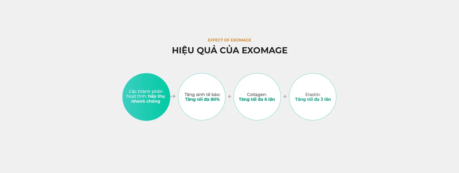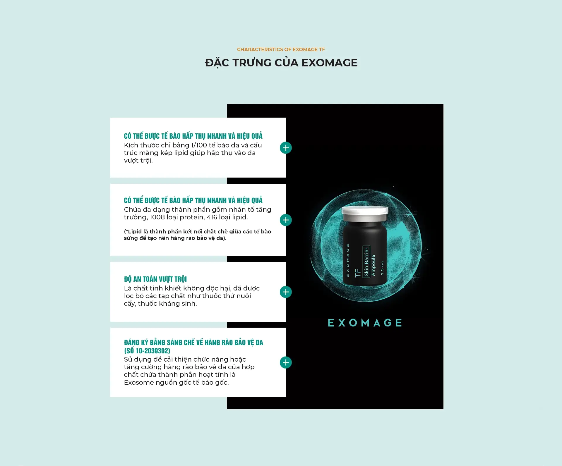 Exomage giải quyết đa dạng các vấn đề liên quan đến lão hóa, chống lão hóa và các vấn đề khác về da. Sản phẩm đặc biệt hiệu quả đối với tình trạng giảm độ đàn hồi, da thiếu sức sống, kết cấu da thô ráp, mụn trứng cá, thu nhỏ lỗ chân lông, viêm da cơ địa (Atopy) và nếp nhăn nhỏ.