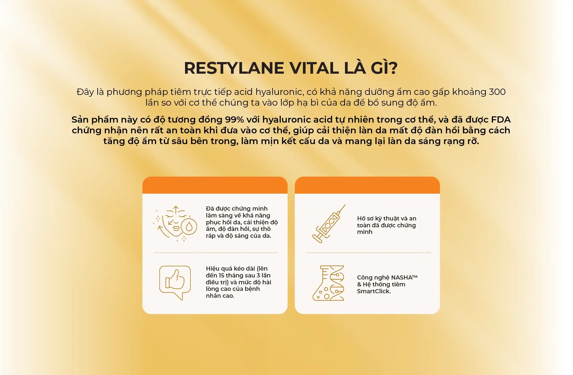 Restylane Skin Booster Vital là một chất làm đầy da chứa acid hyaluronic giúp tăng độ ẩm và độ đàn hồi cho da.