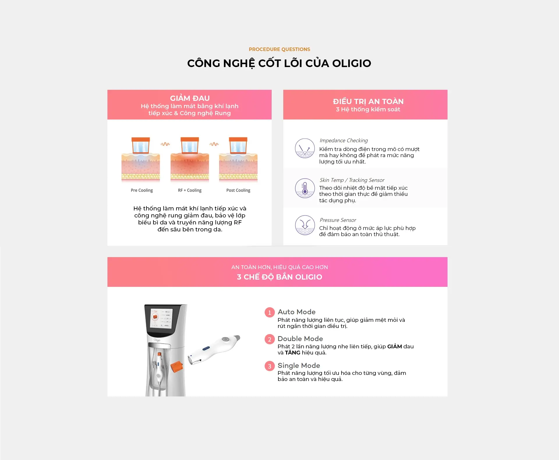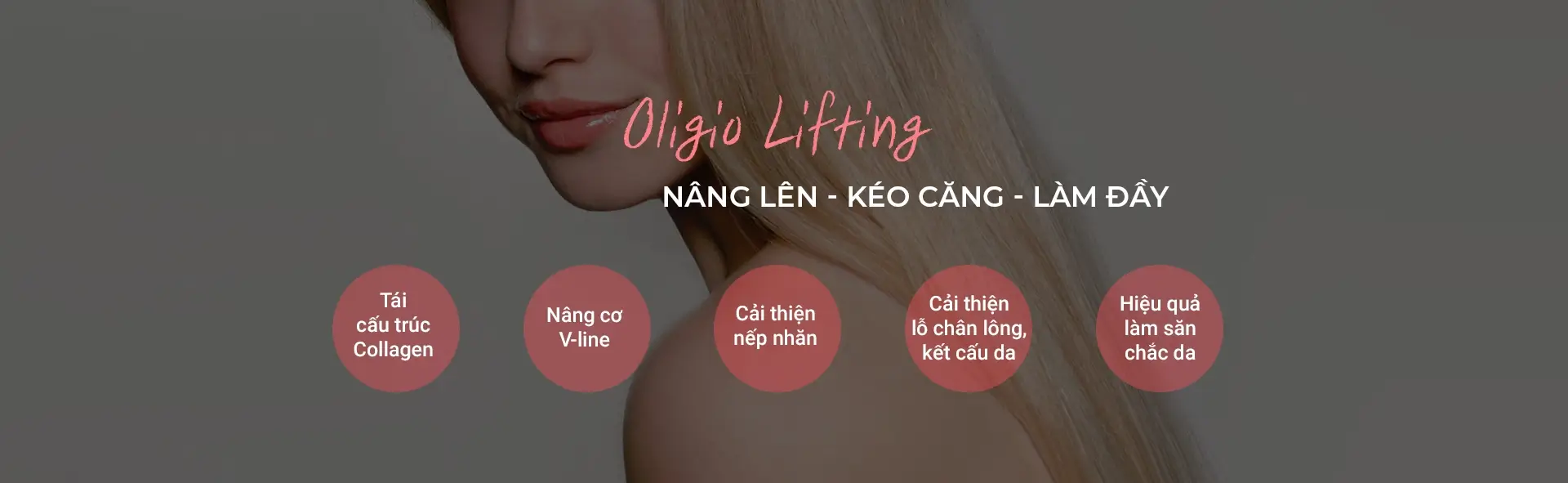 Oligio là liệu pháp sử dụng sóng cao tần RF để kích hoạt tăng sinh Collagen dưới lớp trung bì. Nhiệt năng sinh ra từ sóng cao tần đơn cực, kết hợp dòng điện an toàn, được truyền đến lớp trung bì gây biến tính collagen, từ đó cải thiện tình trạng da chảy xệ, nọng cằm và kết cấu da. Điểm đặc biệt là Collagen sẽ được sản sinh dần dần sau điều trị, giúp duy trì hiệu quả trong thời gian dài. Phương pháp không xâm lấn nên không cần gây tê, ít đau nhờ tích hợp chế độ làm mát và rung.