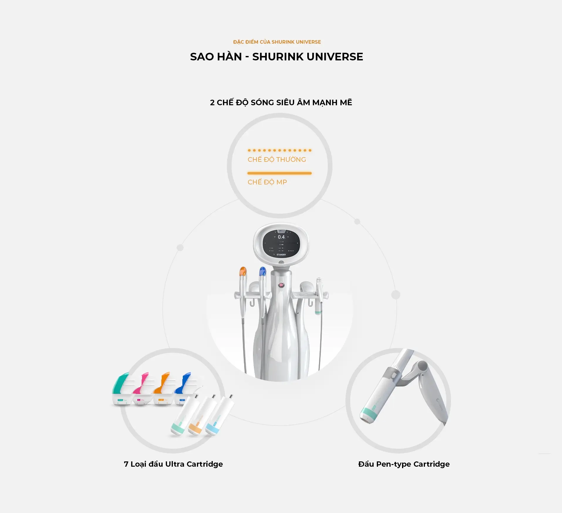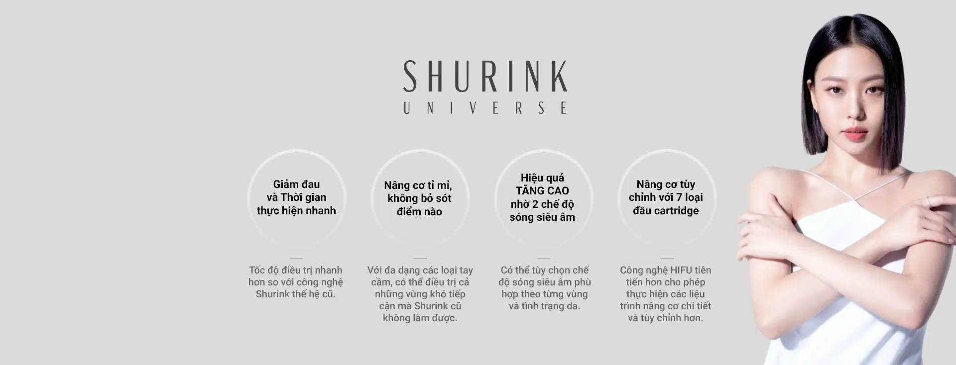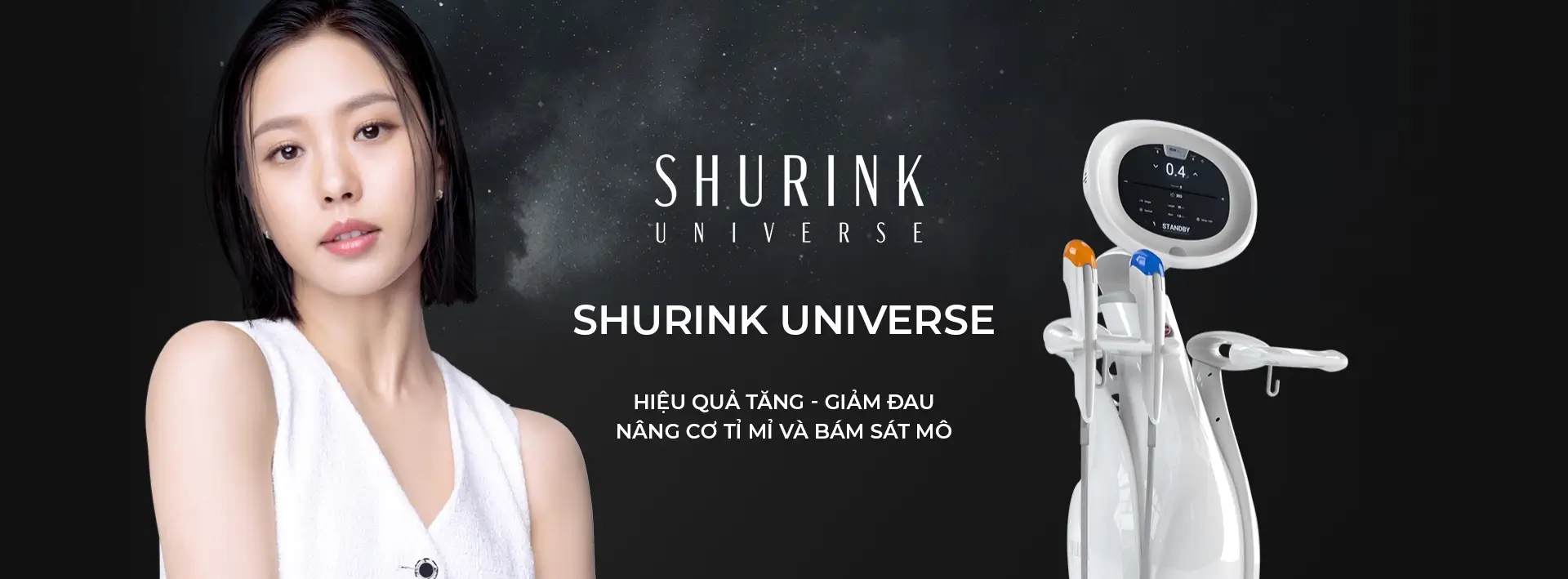 Shurink Universe là thiết bị nâng cơ sử dụng sóng siêu âm hội tụ cường độ cao (HIFU). Đây là thế hệ thứ 2 của dòng máy Shurink, giúp hội tụ năng lượng vào lớp cân cơ (SMAS) mà gần như không gây tổn thương bề mặt da, kích thích tái tạo Collagen và co rút các mô chảy xệ, giúp cải thiện độ đàn hồi toàn diện.