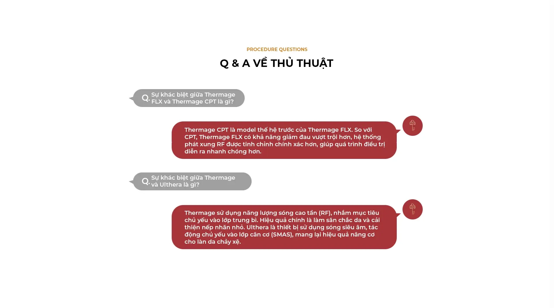 1 Đối với Thermage, quá trình tái cấu trúc Collagen diễn ra từ từ trong vòng 1 – 2 tháng sau điều trị. Thông thường, khuyên dùng lặp lại liệu trình với chu kỳ 1 năm.